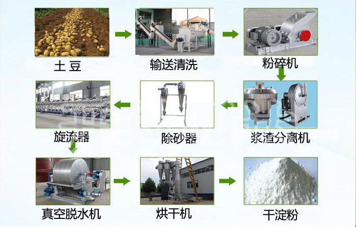 土豆→(清洗輸送機(jī))→清洗(清洗轉(zhuǎn)籠)→粉碎(錘片式粉碎機(jī)或銼磨機(jī))→漿渣分離(壓力曲篩或離心篩、漿渣分離園篩)→除砂(除砂器)→蛋白纖維分離(碟片分離機(jī)、濃縮凈化旋流器機(jī)組)→脫水(離心機(jī)或真空脫水機(jī))→烘干(低溫低塔氣流對(duì)撞淀粉烘干機(jī))→包裝入庫(kù)。